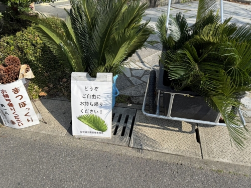 ソテツの葉をお分けしています 2026/03/12 県立美術館の北側に結構大きなソテツの葉を剪定しました。 管理事務所玄関前でお配りしています。 ご入用の方がいらっしゃったら、ご自由にお持ちください。 一覧に戻る